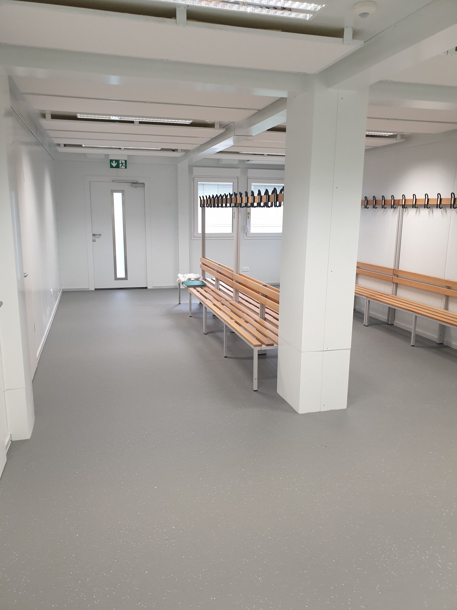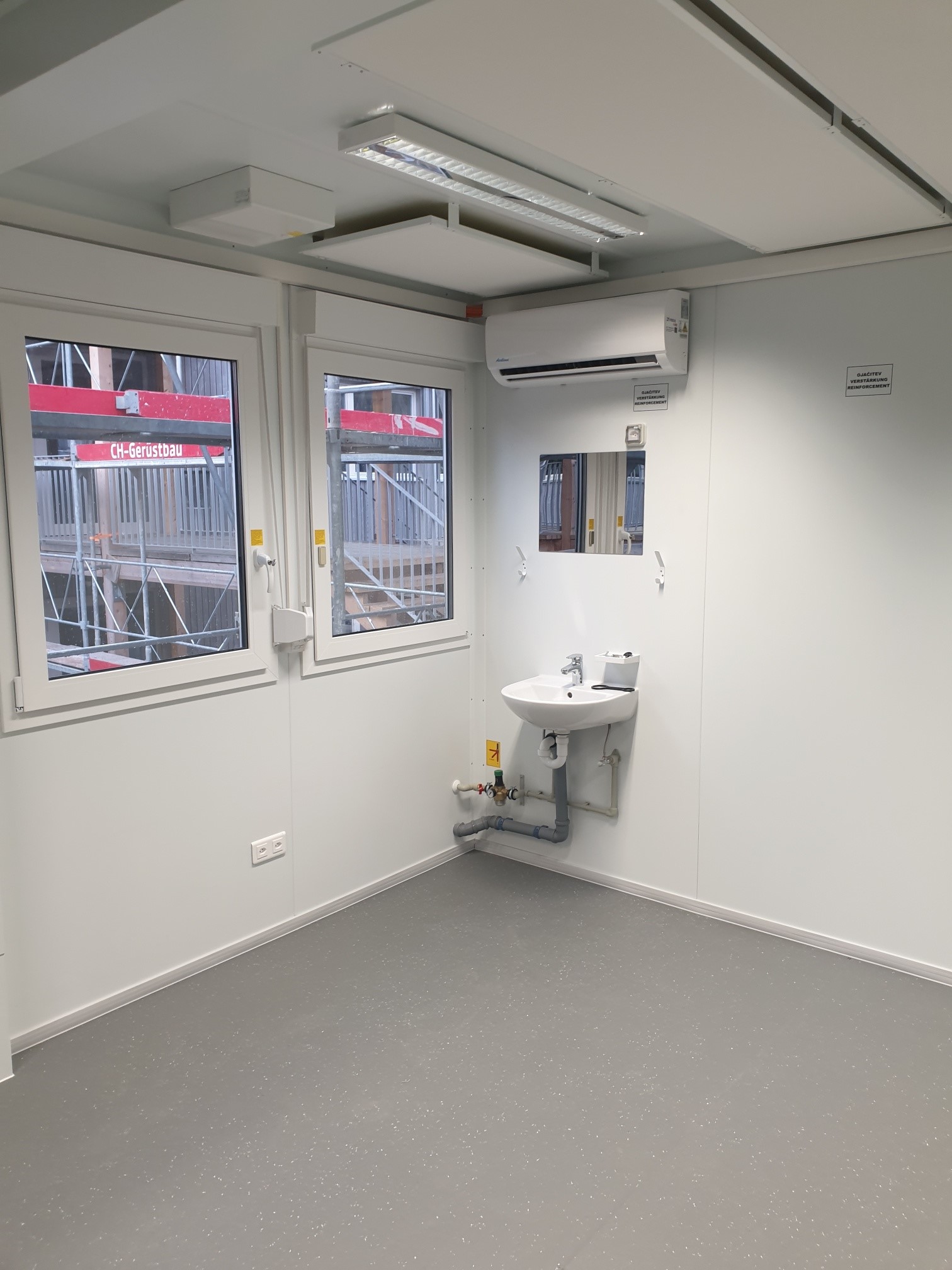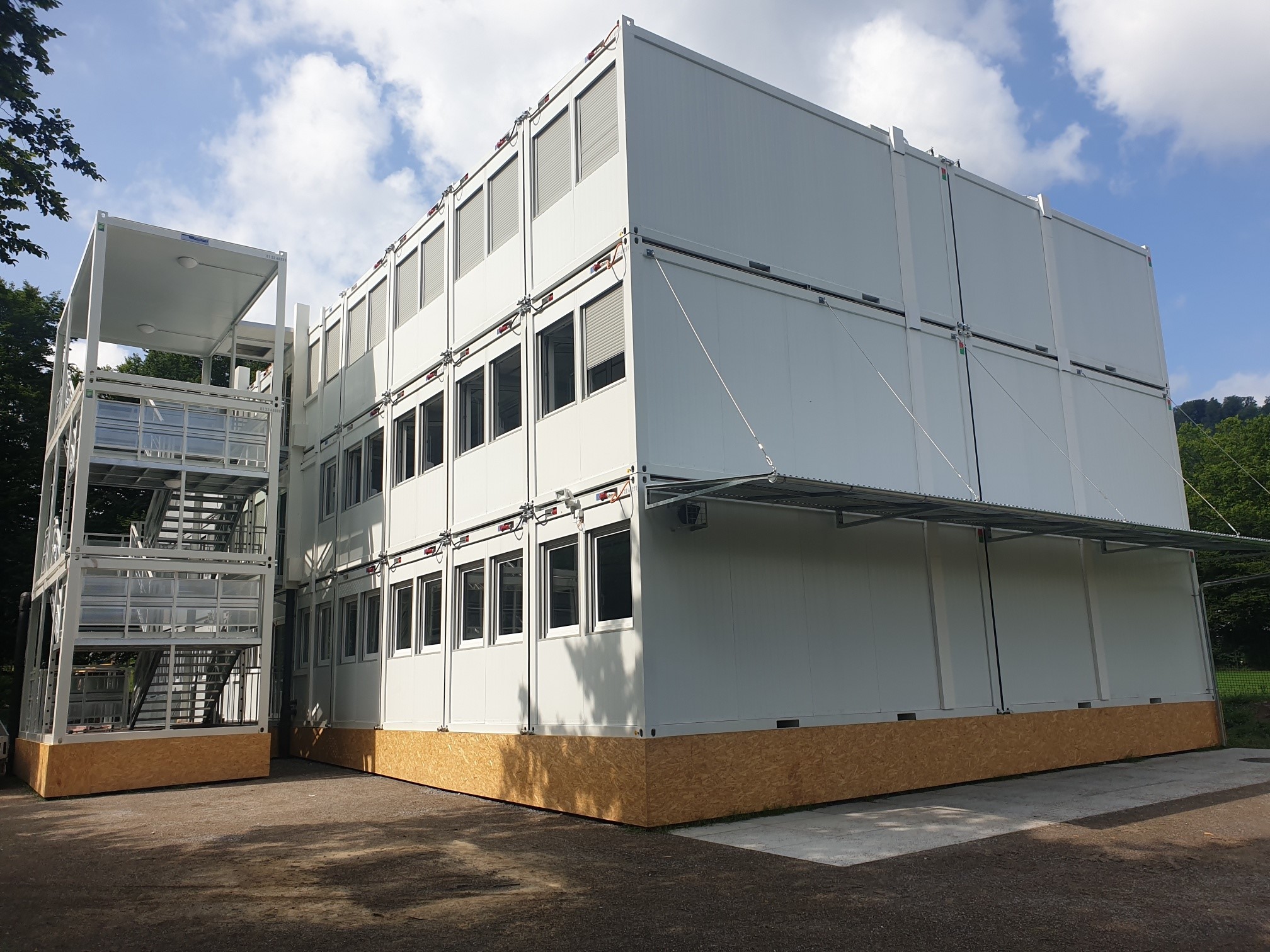 Ausgestattet mit Luft-Luft-Wärmepumpen für Heizung und Kühlung sowie modernen LED-Rasterleuchten bietet das Provisorium optimale Lernbedingungen. Ein verzinkter Treppenturm mit Überdachung und eine barrierefreie Rampe sorgen für sicheren Zugang.