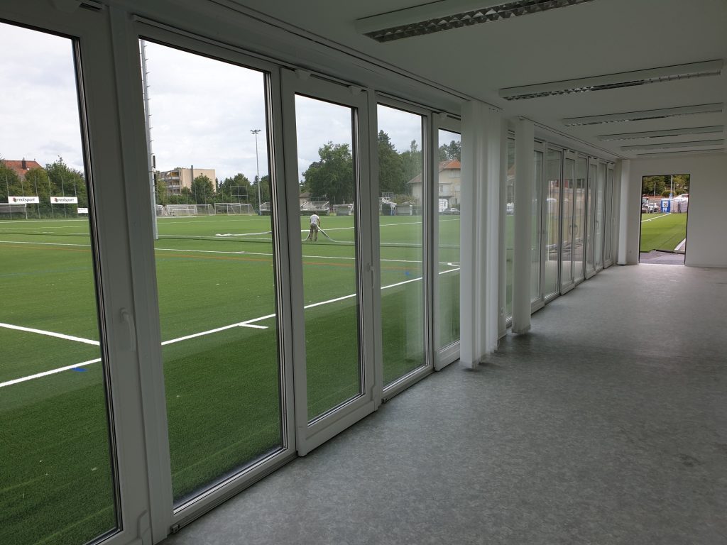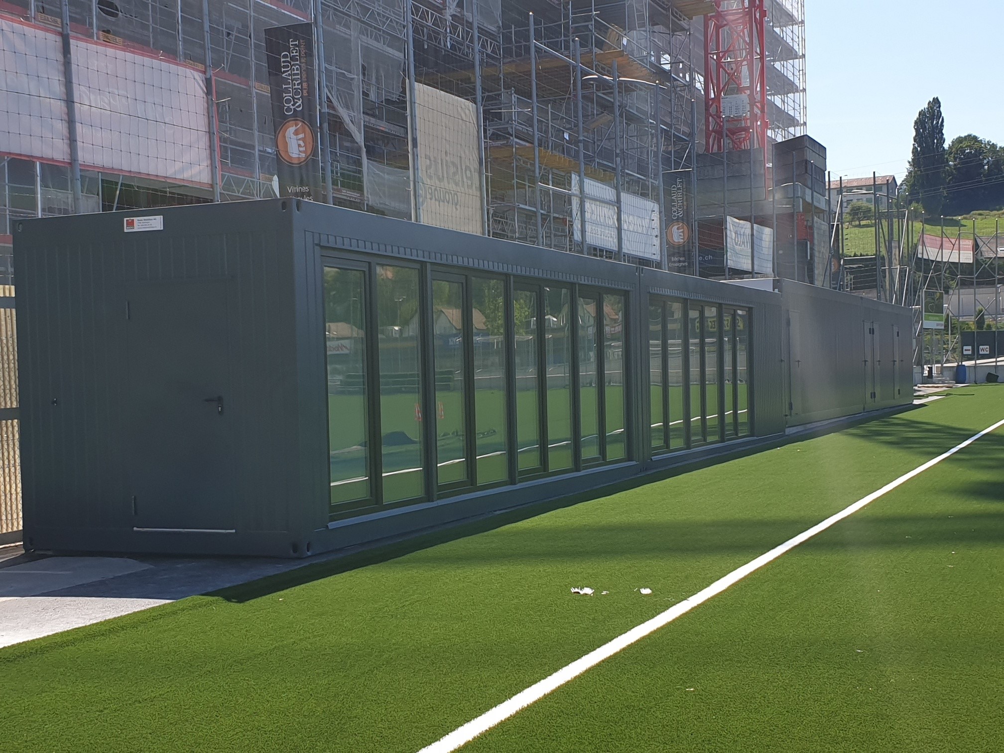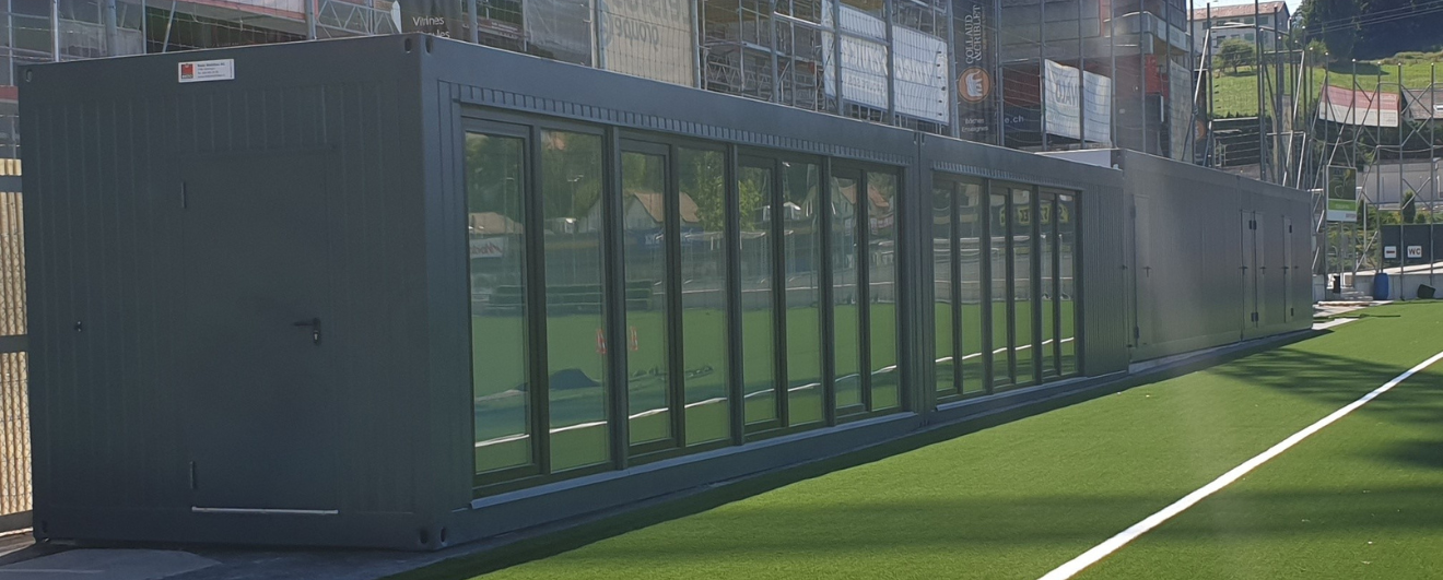 Für die Frutiger SA realisierten wir eine moderne Buvette in Modulbauweise beim Kunstrasenplatz St. Léonard in Freiburg. Die kompakte, einstöckige Anlage besteht aus 4 Modulen mit einer Gesamtfläche von 36 x 3 Metern und wurde im Jahr 2019 erfolgreich fertiggestellt.