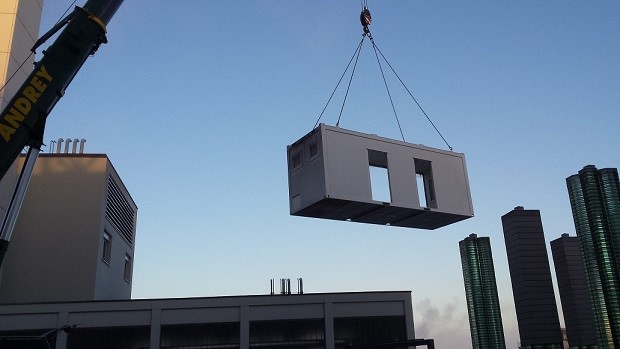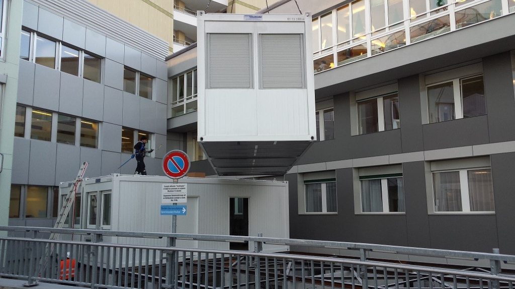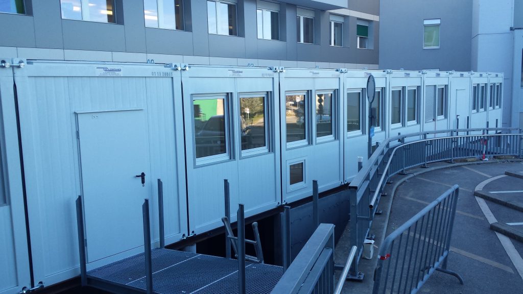 Für das HFR – Freiburger Spital realisierten wir ein Büroprovisorium, das zusätzlich als Notfallstelle genutzt wird. Die einstöckige Anlage umfasst 12 Module inklusive Sanitärmodul auf einer Gesamtfläche von 29,4 x 7,3 Metern.