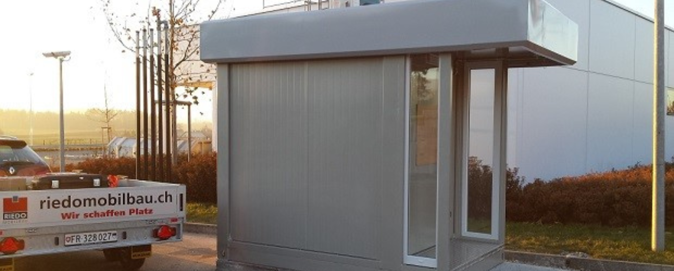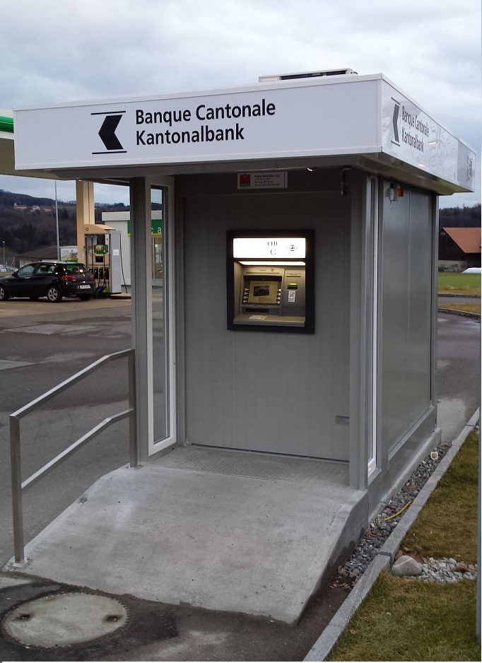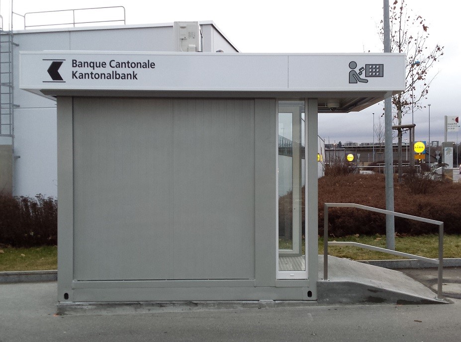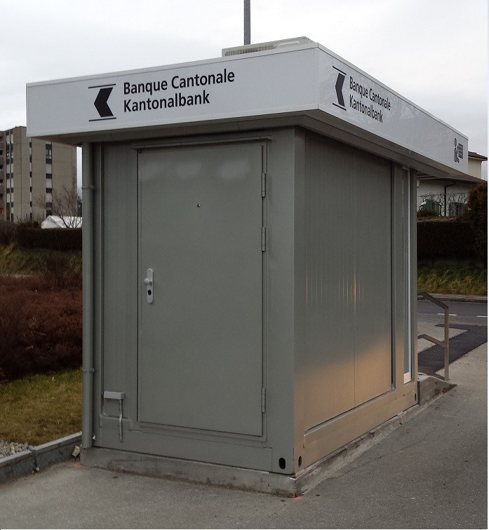 Für die Freiburger Kantonalbank (FKB) realisierte die Riedo Mobilbau AG in Marly ein kompaktes Bankomatmodul in robuster Modulbauweise. Mit einer Fläche von 3.6 x 1.8 m bietet es eine wetterfeste und sichere Lösung für den temporären Betrieb eines Bankomaten.