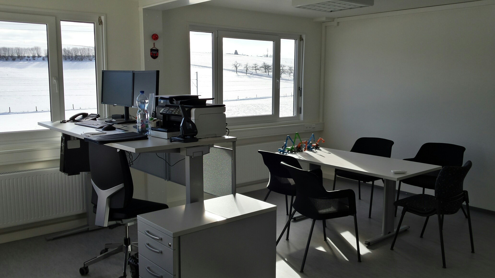 Das Gebäude bietet helle Büroräume mit Fermacell-Beplankung, tapezierten Wänden und Decken aus Glasfaser. Eine integrierte Split-Klimaanlage, eine Einbauküche mit Mittagstisch sowie drei vollständig ausgestattete Sanitärmodule sorgen für hohen Komfort. Beheizt wird das Gebäude energieeffizient über Warmwasserradiatoren mit Luft/Wasser-Wärmepumpe. Der Projektabschluss erfolgte im Januar 2015 nach nur fünf Monaten Gesamtprojektzeit.