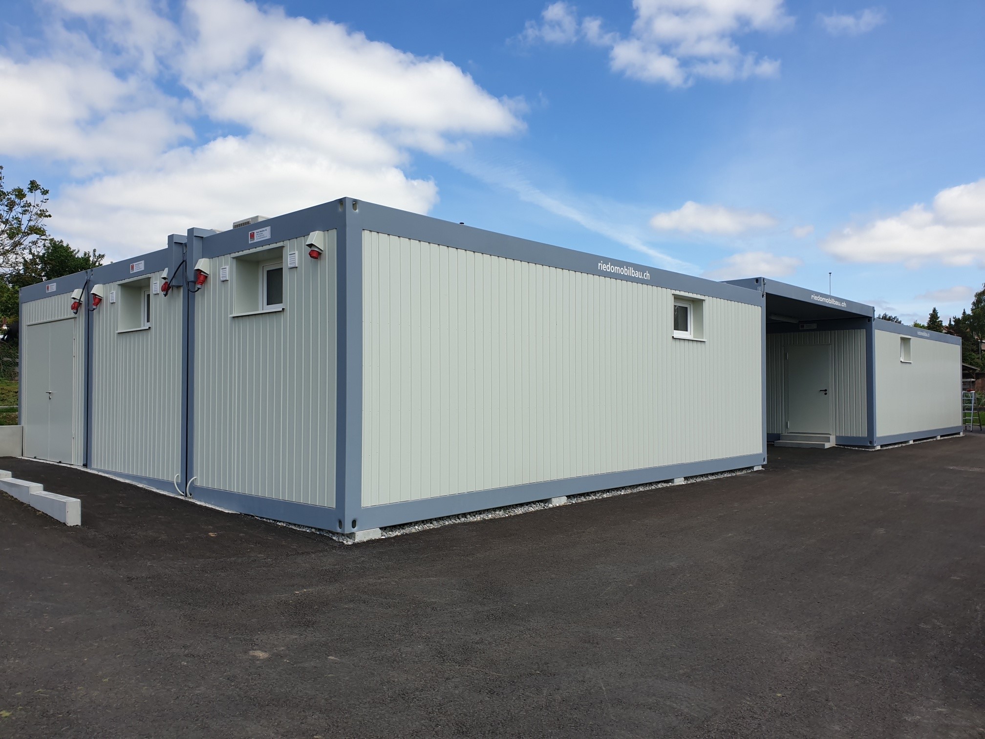 Für die Gemeinde Bassersdorf realisierte die Riedo Mobilbau AG eine moderne Garderoben- und Duschanlage in effizienter Modulbauweise. Die einstöckige Anlage mit einer Fläche von 24.02 x 8.99 m besteht aus sieben Modulen und bietet funktionale, robuste und komfortable Räumlichkeiten für den FC Bassersdorf.