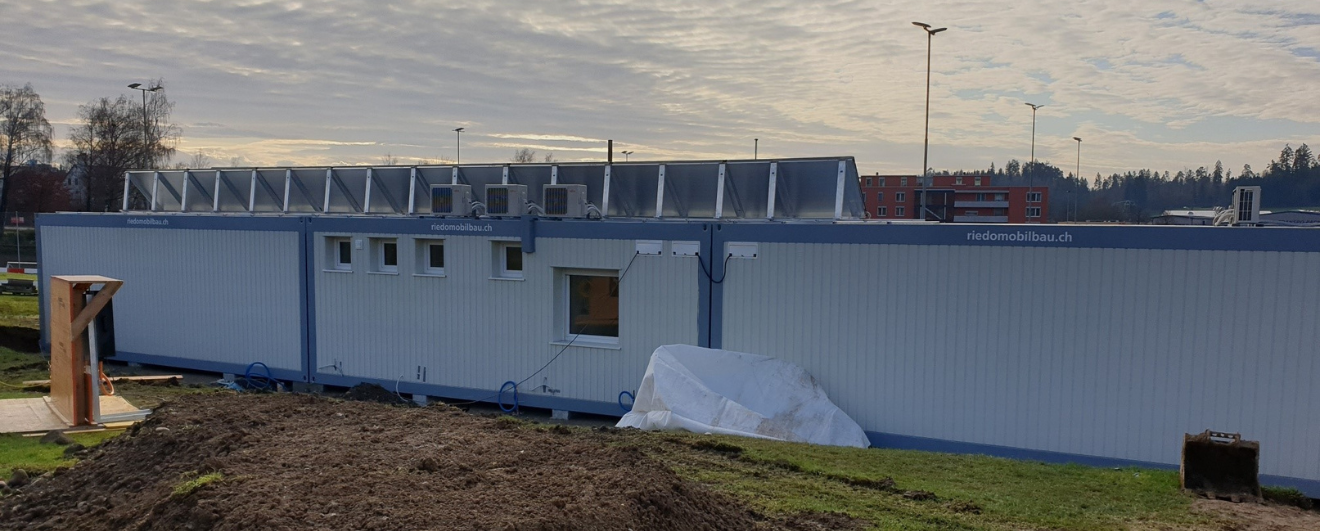 Ausgestattet mit einer Luft-Luft-Wärmepumpe zum Heizen und Kühlen sorgt das Gebäude für ein angenehmes Raumklima zu jeder Jahreszeit. Dank der modularen Bauweise konnte das Projekt in nur sechs Wochen Bauzeit fertiggestellt werden. Die Anlage wurde 2019 erstellt und von der Gemeinde Bassersdorf gekauft.