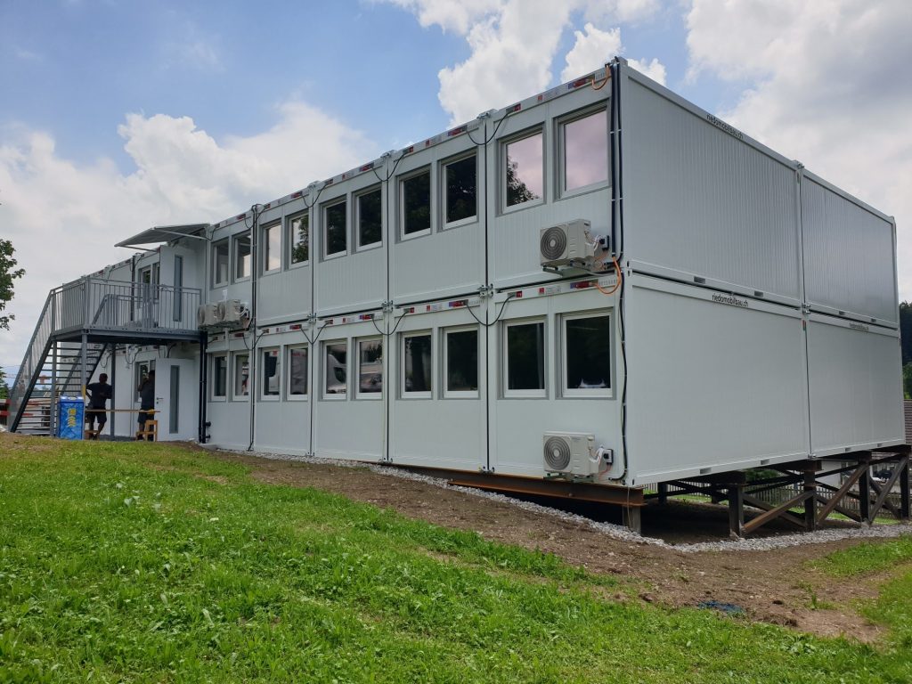 Die Anlage ist energieeffizient mit Luft-Luft-Wärmepumpen zum Heizen und Kühlen ausgestattet und wurde innert kurzer Zeit umgesetzt: drei Monate Planung, zwei Monate Produktion und nur eine Woche Montage. Eine flexible, sichere und moderne Lösung für temporäre Bildungsräume mit einer Mietdauer von 1.5 bis 2 Jahren.
